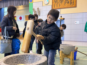 令和8年の水曜会主催餅つき大会も、本校を会場として行われました。子どもたちは、エイサーの演舞と太鼓の演奏を披露するため、一生懸命練習してきました。演舞・演奏終了後、会場の皆様から大きな拍手をいただき、子どもたち一人一人が達成感を感じる1日となりました。餅つきの体験も楽しく取り組むことができました。